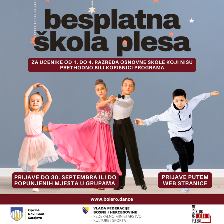 Sportsko plesni klub Bolero u saradnji sa Općinom Novi Grad Sarajevo i Federalnim ministarstvom kulture i sporta sa ponosom najavljuje početak Besplatne škole plesa za učenike od 1. do 4. razreda osnovne škole. Program je namijenjen djeci koja do sada nisu bila uključena u naše aktivnosti, a koja žele zakoračiti u svijet plesa kroz druženje, zabavu i učenje novih vještina.
